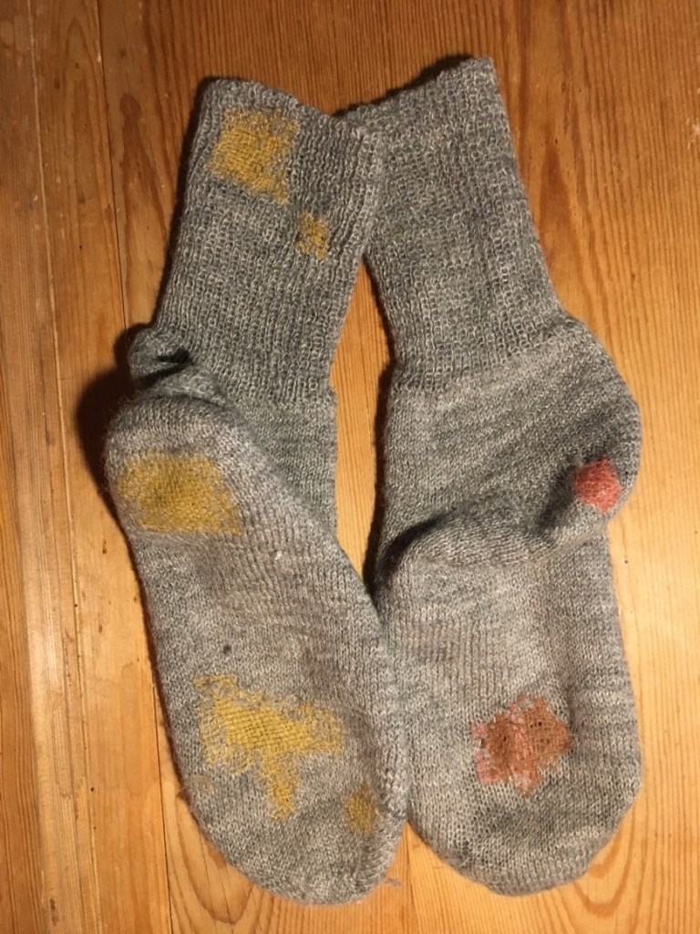 Mitt egna bidrag till projekt stoppa och laga till förbannelse är dom här sockarna. Jag har haft dom i 10-15 år, mamma köpte dom på Söderköpings julmarknad till nån jul. Helt perfekta sockar och som synes har jag stoppat dom en del. Det ska bli spännande att se hur länge jag kan ha kvar dom och hur mycket av min socka som kommer vara kvar och hur mycket som kommer vara utbytt till slut. ”Spännande”. Det är det lilla i livet som betyder. :)))