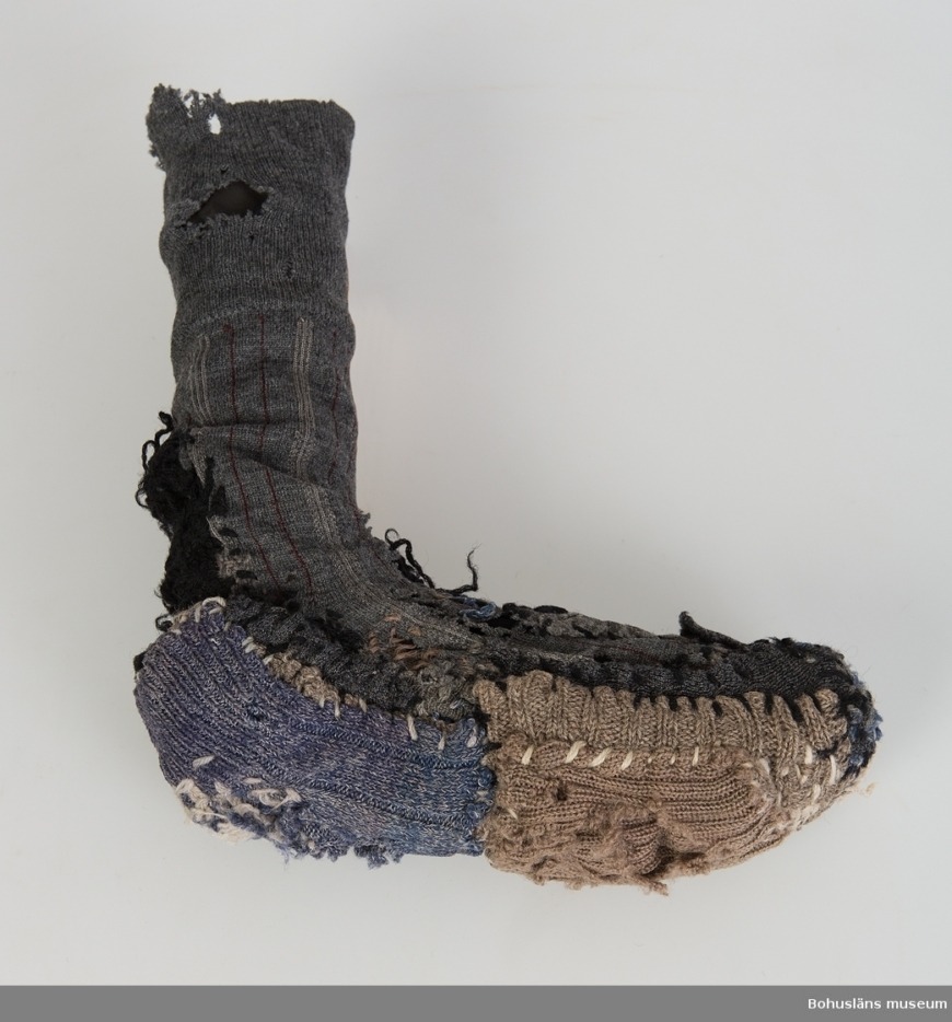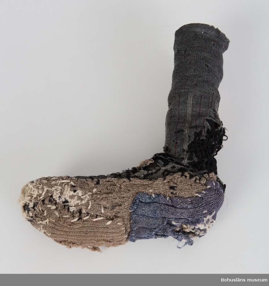 Det står i beskrivningen att den är ”mycket stoppad och lappad, delvis svårt att avgöra vad som är den ursprungliga sockan och vad som är senare lagningar.” Så många frågor. Jag gissar att skaftet tillhör den ursprungliga sockan som ser ut att vara en tunn fin(are) ullstrumpa. Sen har man sytt på nån slags sula av två olika mycket grövre stickade bitar. Varför skulle man vilja ha en sån grov sula på en strumpa? Var grundstrumpan trasig under hela foten? Kanske så tunnsliten? Sen stygnen, som ser ut att vara sydda av ett barn eller någon som är full. Om man lagt så mycket möda vid att laga, och eventuellt flera gånger, varför har man inte försökt göra det lite tätare, med mindre stygn? Gjort en mer långsiktig stoppning. Den här är lagad lite som att den ska hålla det närmsta dygnet. Det kanske är så? Med den där tjockleken på garn och nål måste man ju ha gjort nya hål i strumpan. Över hälen kan man se att det gjorts en stoppning i tuskaft, vilket ändå lär betyda att det är någon som har haft lite koll på strumpstoppning. Vem har lagat, varför på det här viset och när? Är det nån som verkligen bara haft ett par strumpor och inte kunnat skaffa nya, eller nån som är tokigt sparsam? Jag har eventuellt blivit knäpp av att titta på den här bilden så mycket men jag tycker också att sockan är väldigt snygg. Färgställningen! Obryddheten! Mixen av grovt och tunt!